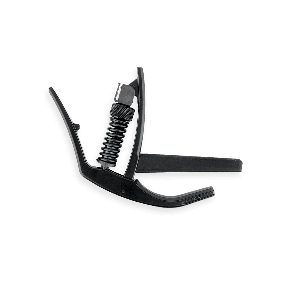 Designed specifically for classical guitars and instruments with flat (non-radiused) fretboards, the Artist Classical Capo utilizes a patented trigger geometry reducing the force required to open and close the capo while applying even tension regardless of neck profile. Combined with the micrometer tension adjustment and direct horizontal pressure, the Artist Classical Capo virtually eliminates pulling the strings side to side and the need to retune during use. Additionally, the trigger design and lightweight aluminum construction add no obstruction or noticeable weight to the neck of the instrument. The Artist Classical Capo includes a micrometer tuner mounting bracket, allowing you to add tuning capabilities to the capo. Tuner sold separately. Designed in collaboration with Ned Steinberger