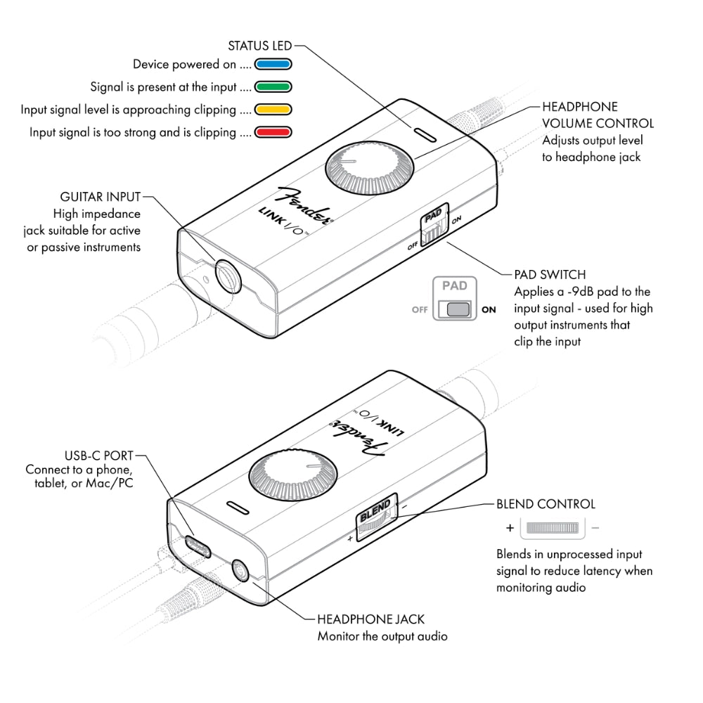 The perfect tool to capture your next riff, the Fender Link I/O™ is a studio-grade audio interface that can fit in your pocket. The Fender Link I/O provides pristine, bi-directional audio over USB connection, making it a one stop shop for connecting your instrument and headphones to your phone, tablet, Mac, or PC.