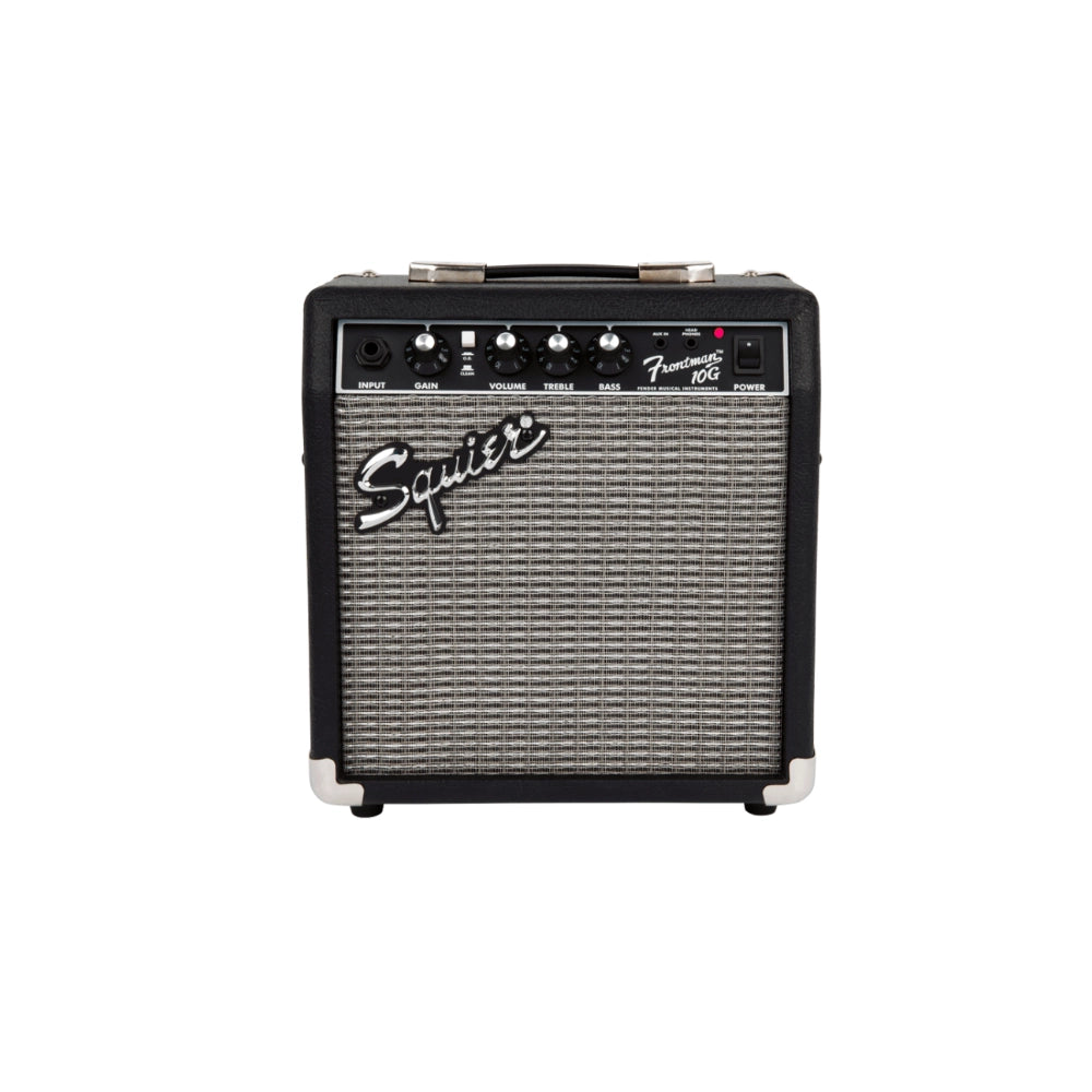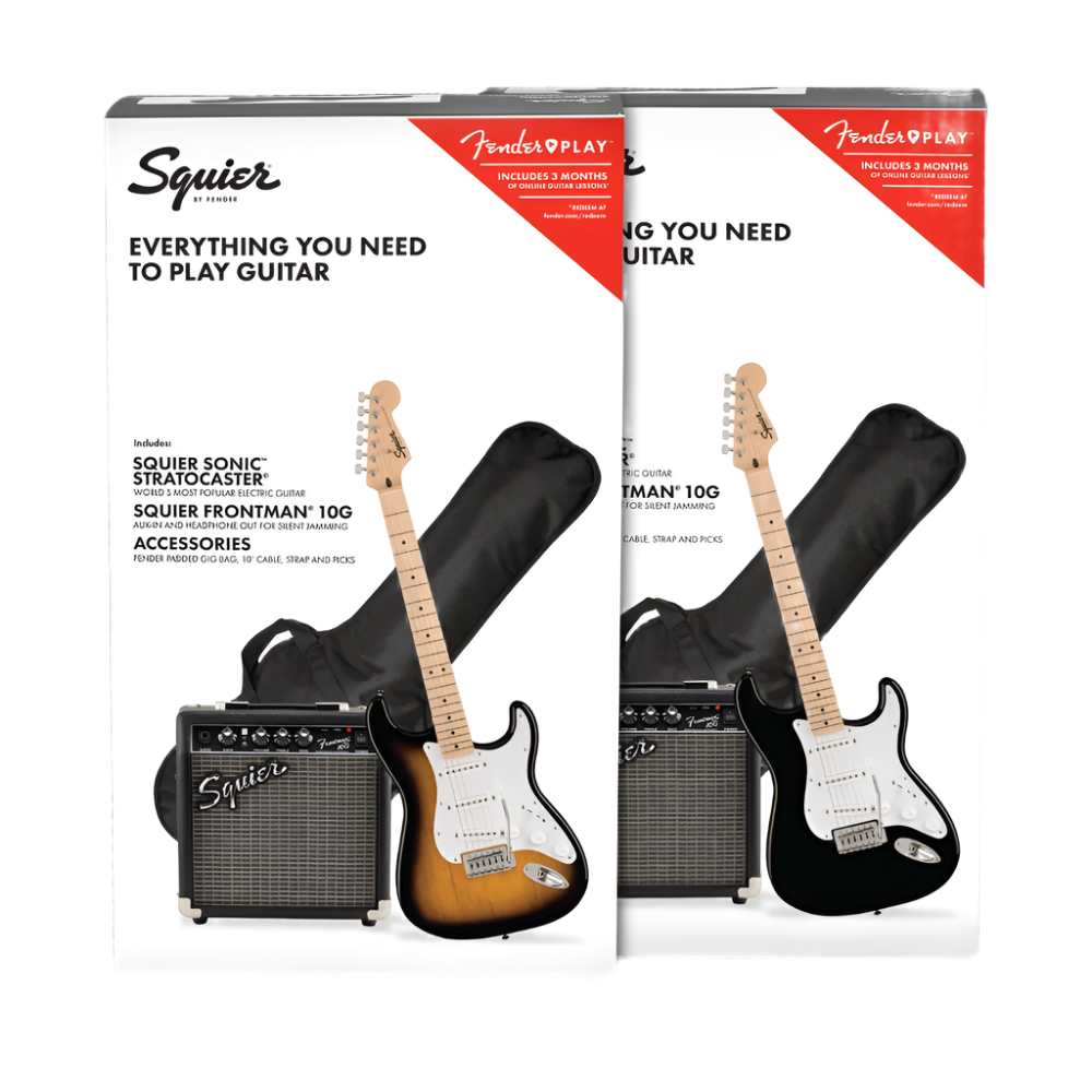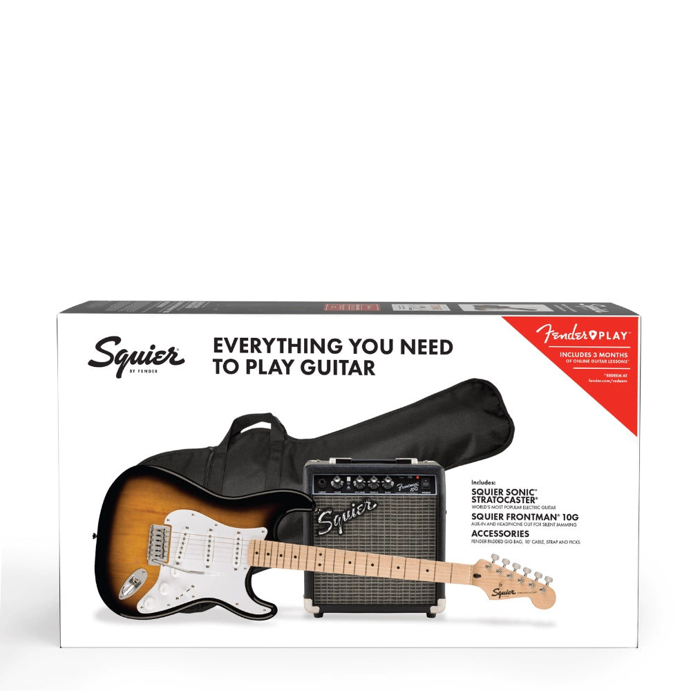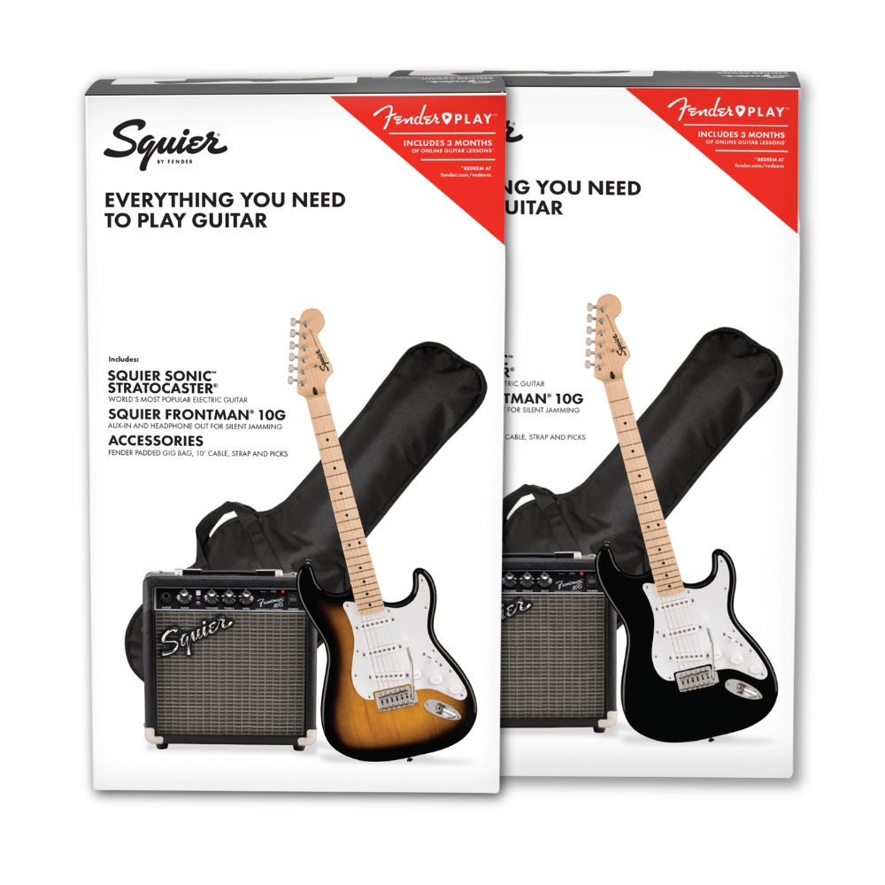 The Squier Sonic® Stratocaster® Pack is ready to launch any musical adventure into warp speed, offering new players a convenient collection of guitar essentials in one box. An icon of music history and a great choice for beginners, the Stratocaster is renowned for its stylish and comfortable contoured body and slim, easy-to-play neck. Three single-coil pickups produce inspiring and versatile tone perfect for any musical genre and a tremolo bridge invites expressive vibrato effects that are sure to spark creativity. The compact and portable Squier® Frontman® 10G amplifier features both clean and overdrive channels, two-band EQ for tone control, headphone jack for silent practice and an aux input for connecting a media device. Also included are a padded gig bag, instrument cable, strap and picks, as well as a free 3-month subscription to Fender Play® - the easiest way to learn guitar.