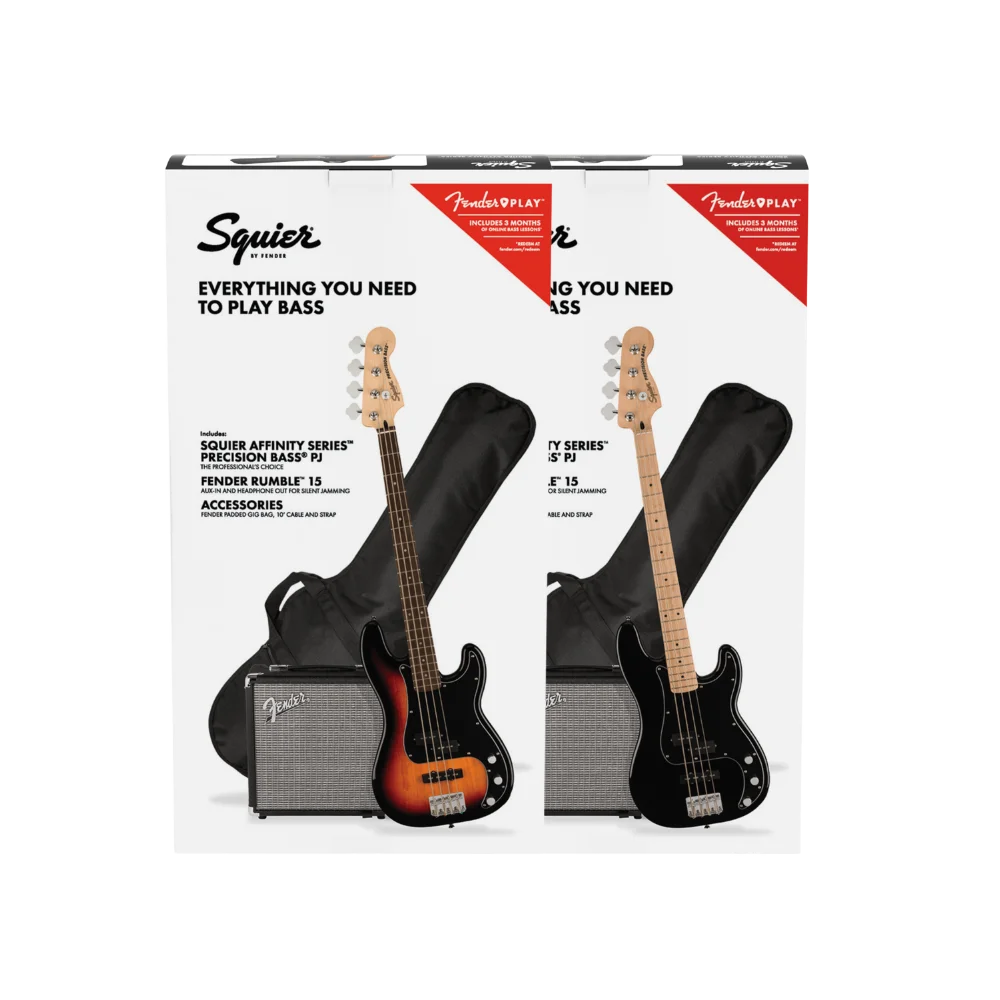 Delivering 15 watts of pure Fender bass tone, the Rumble 15 amplifier features an 8" Fender Special Design speaker, three-band EQ, headphone jack for silent practice and an aux input jack for connecting a media device. With the included padded gig bag, strap and 10' cable, the Squier Affinity Precision Bass PJ Pack has everything you need to turn your affinity for music into a lifelong passion.